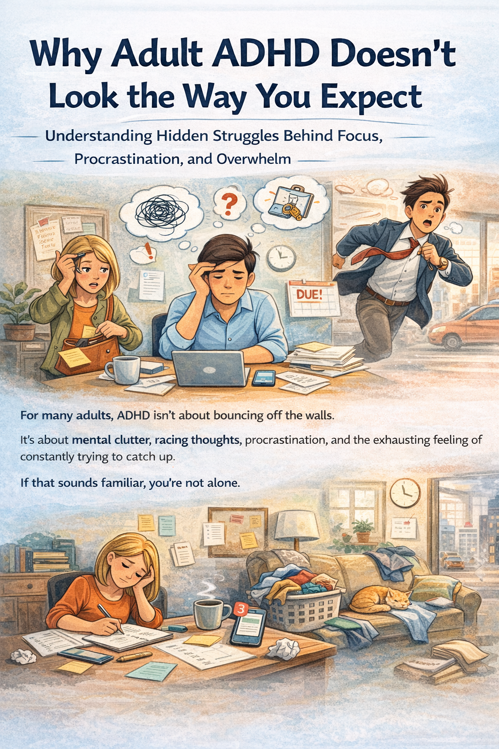 Many adults spend years feeling frustrated or ashamed before realizing ADHD may be part of the picture.